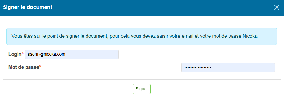 Lorsque le salarié clique sur "Signer", une confirmation de son identifiant et mot de passe Nicoka est nécessaire.
