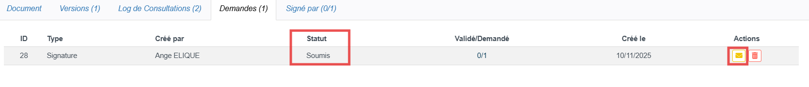 De votre côté, vous pourrez suivre l'état de la demande de signature/ou demande de lecture en cliquant sur l'icône "i".