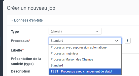 Exemple ci-dessous, nous avons 5 processus différents. Lors de la création d'un job dans Nicoka, vous choisissez le processus que vous souhaitez utiliser.
