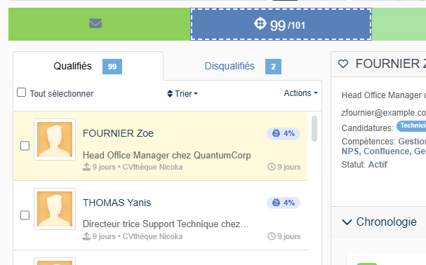 - Sélectionné : Vous évaluez les candidatures reçues et vous choisissez ceux qui correspondent le mieux aux exigences de votre poste vacant. Nicoka CABS vous permet de filtrer et de classer les candidats en fonction de divers critères tels que le nom, la date d'importation, la date de mise à jour, l'origine, l'état d'avancement ou encore l'entreprise.