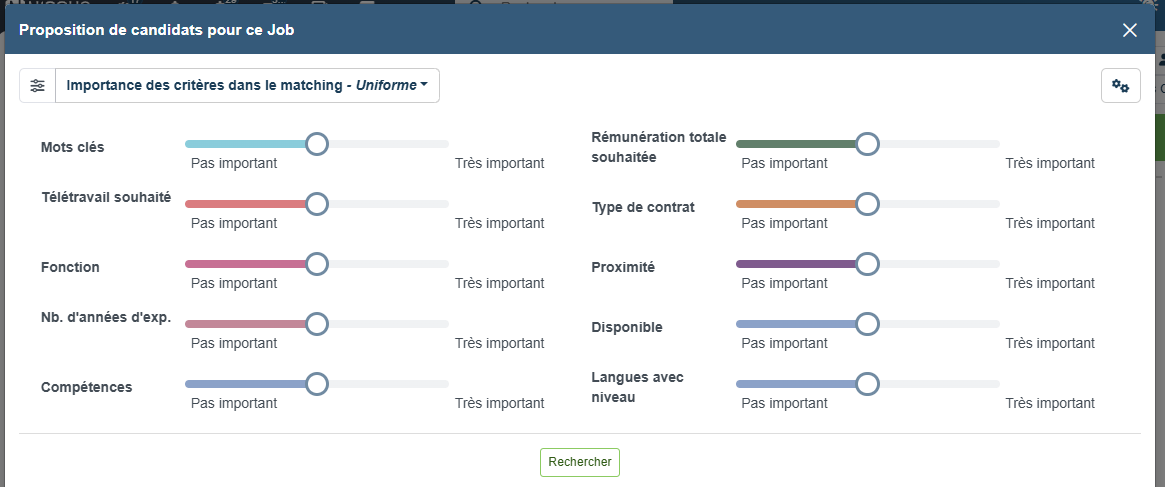 Pour chaque critère actif, l’IA calcule un score de proximité poste ↔ candidat. Les scores sont ensuite pondérés selon vos réglages d’importance puis agrégés en un pourcentage global.