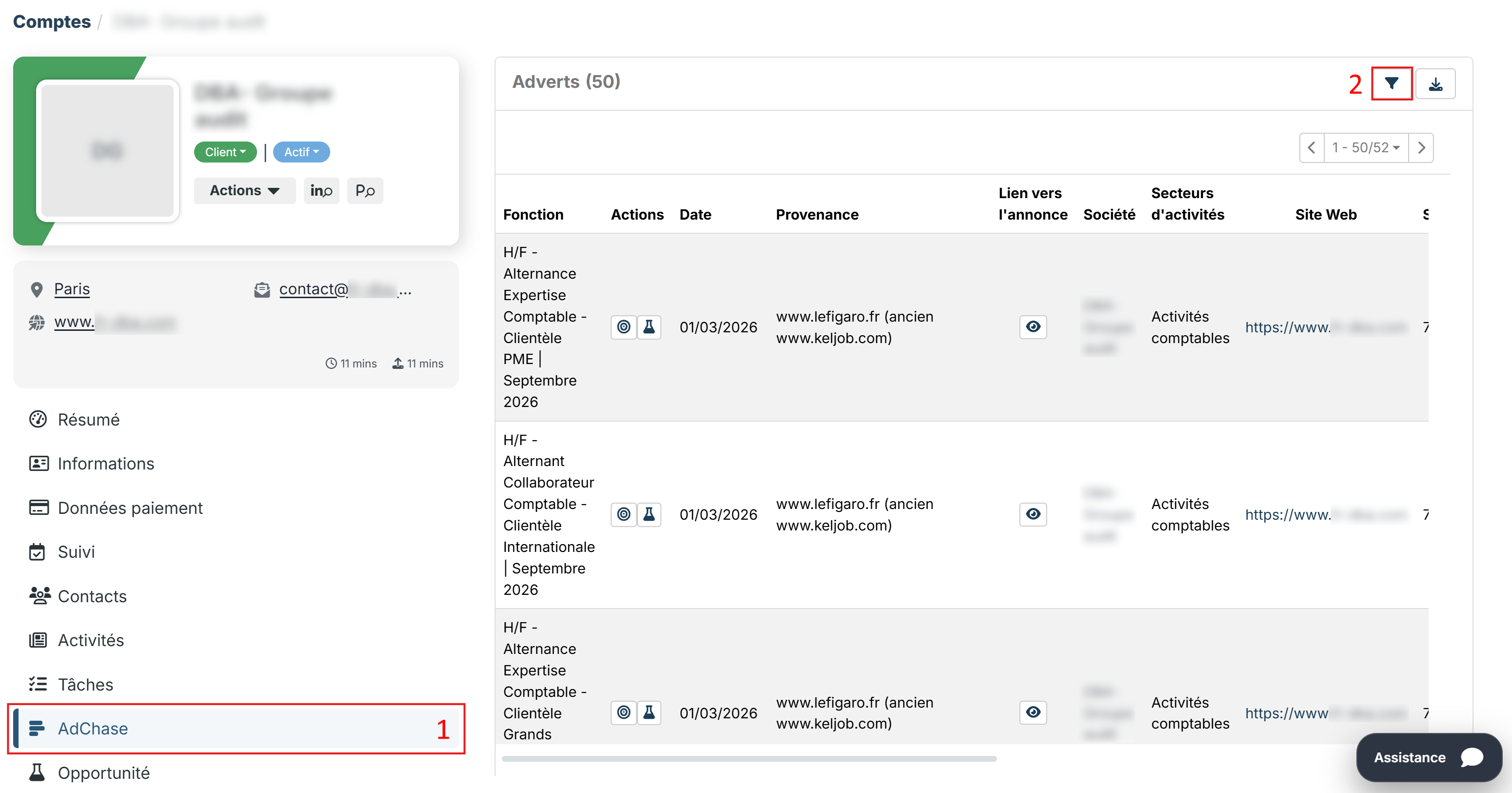 Ouvrez une page de compte, vous voyez maintenant apparaître l'élément de menu AdChase (1). En l'ouvrant, cela va automatiquement lancer une recherche d'offres d'emploi en se basant sur le nom et le SIRET du compte.