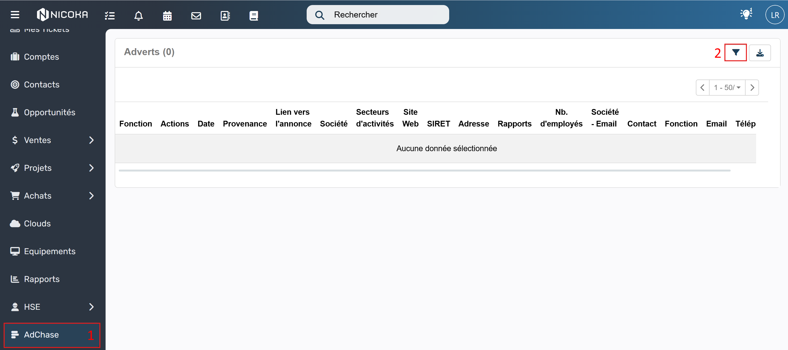 Pour effectuer une recherche d'offres d'emploi comme si vous étiez dans l'interface d'index AdvertsData, vous pouvez maintenant cliquer sur le menu AdChase (1). Pour afficher les différents filtres de recherche, vous devez cliquer sur le bouton en forme d'entonnoir (2).