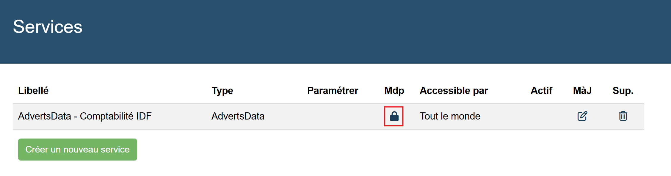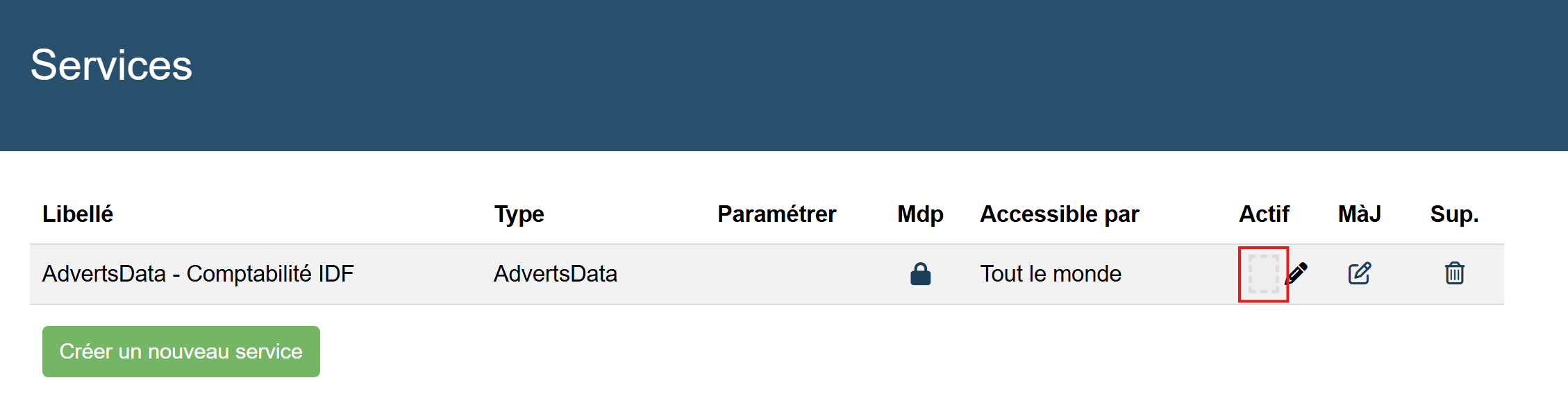 Pour connecter index Advertsdata avec Nicoka, vous devez créer un service. Pour cela, allez dans Paramétrage > Administration > Inter Application > Services puis cliquez sur Créer un nouveau service