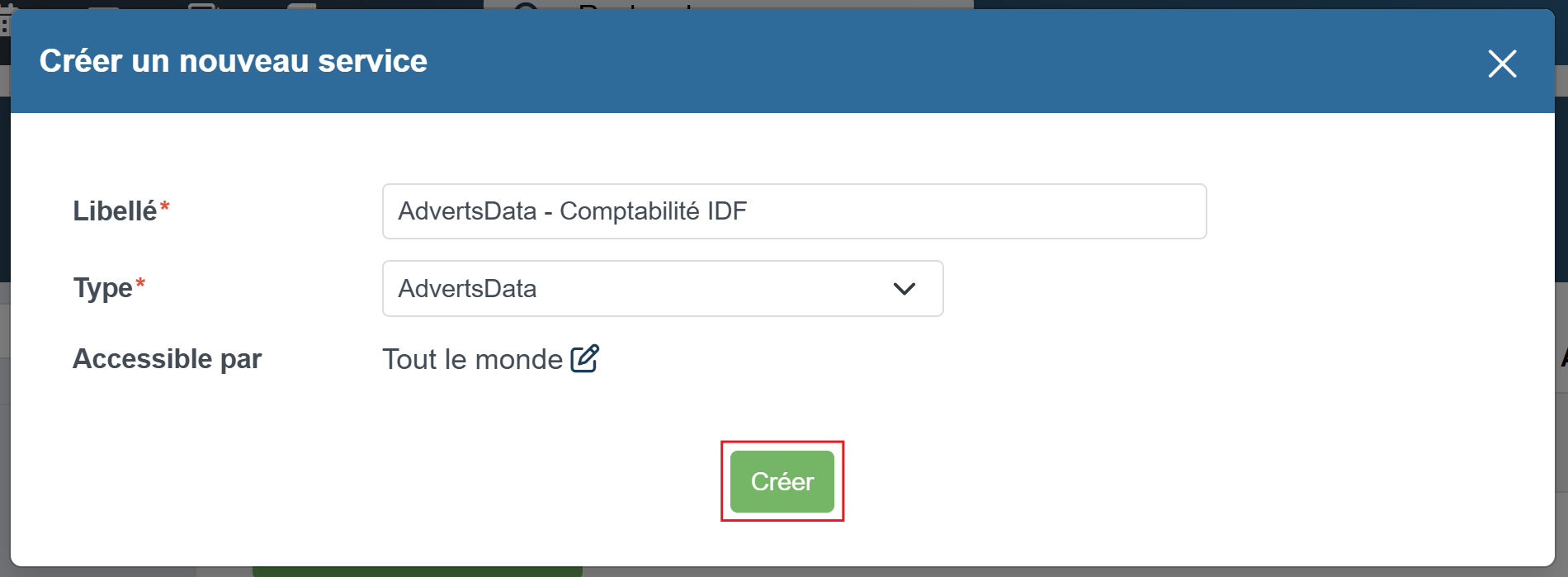 Une fenêtre va s'ouvrir, vous devez saisir un libellé de service qui correspond au domaine du compte Advertsdata que vous allez relier. Vous devez choisir le type AdvertsData puis cliquer sur le bouton Créer