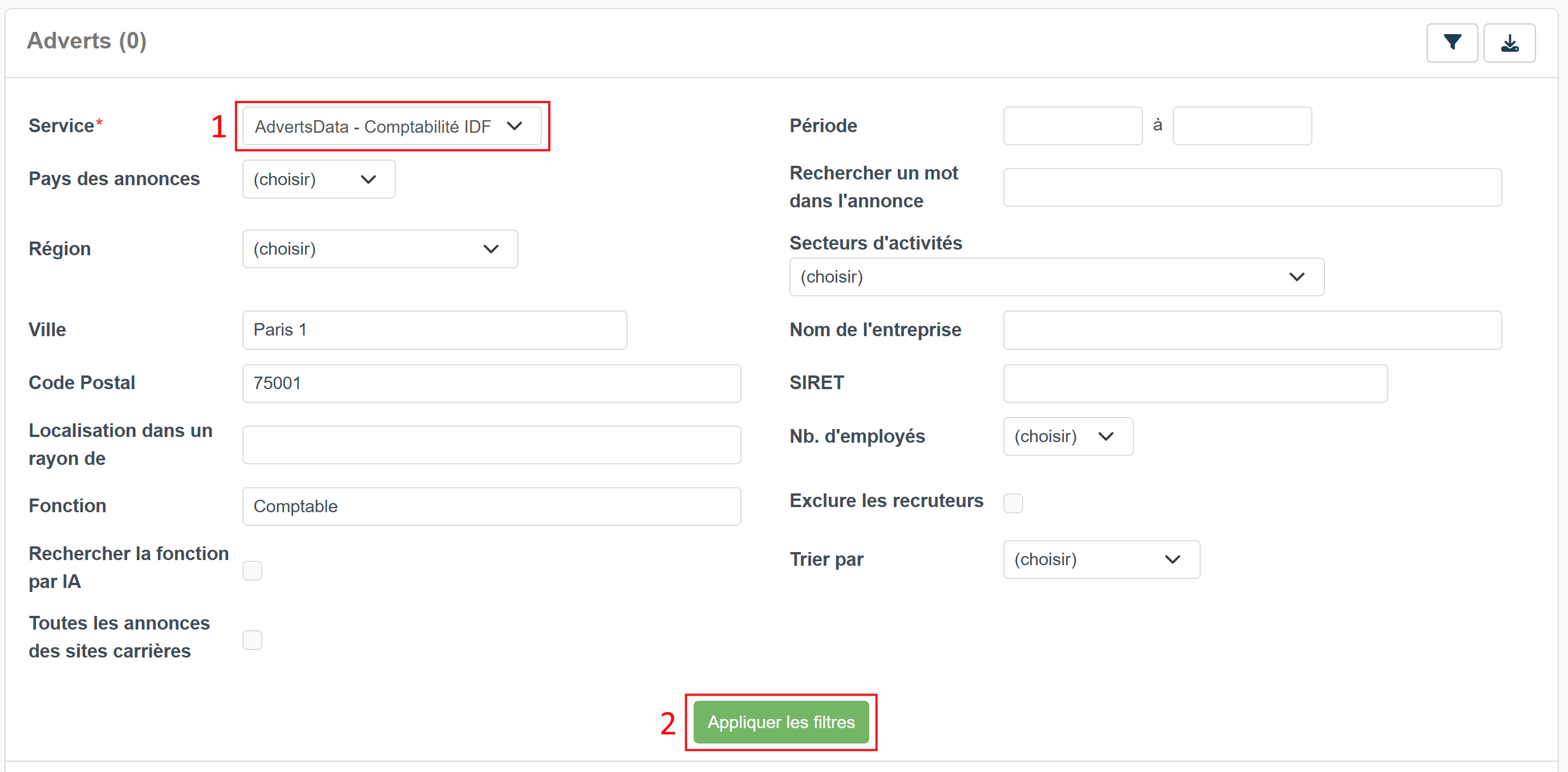 Dans la zone de filtres, vous avez la possibilité de choisir le compte index Advertsdata que vous souhaitez utiliser pour la recherche en utilisant la liste déroulante Service (1). Vous retrouvez ensuite de nombreux filtres qui permettent d'effectuer une recherche spécifique. Vous pouvez lancer la recherche en cliquant sur le bouton Appliquer les filtres (2)