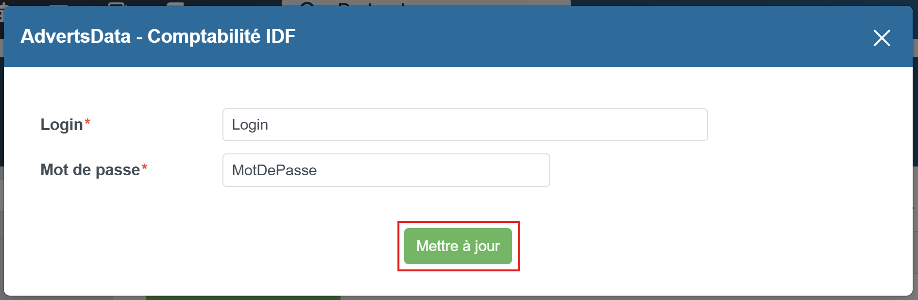 Une fenêtre va s'ouvrir, vous pourrez saisir vos identifiants de connexion au compte Advertsdata puis cliquer sur Mettre à jour